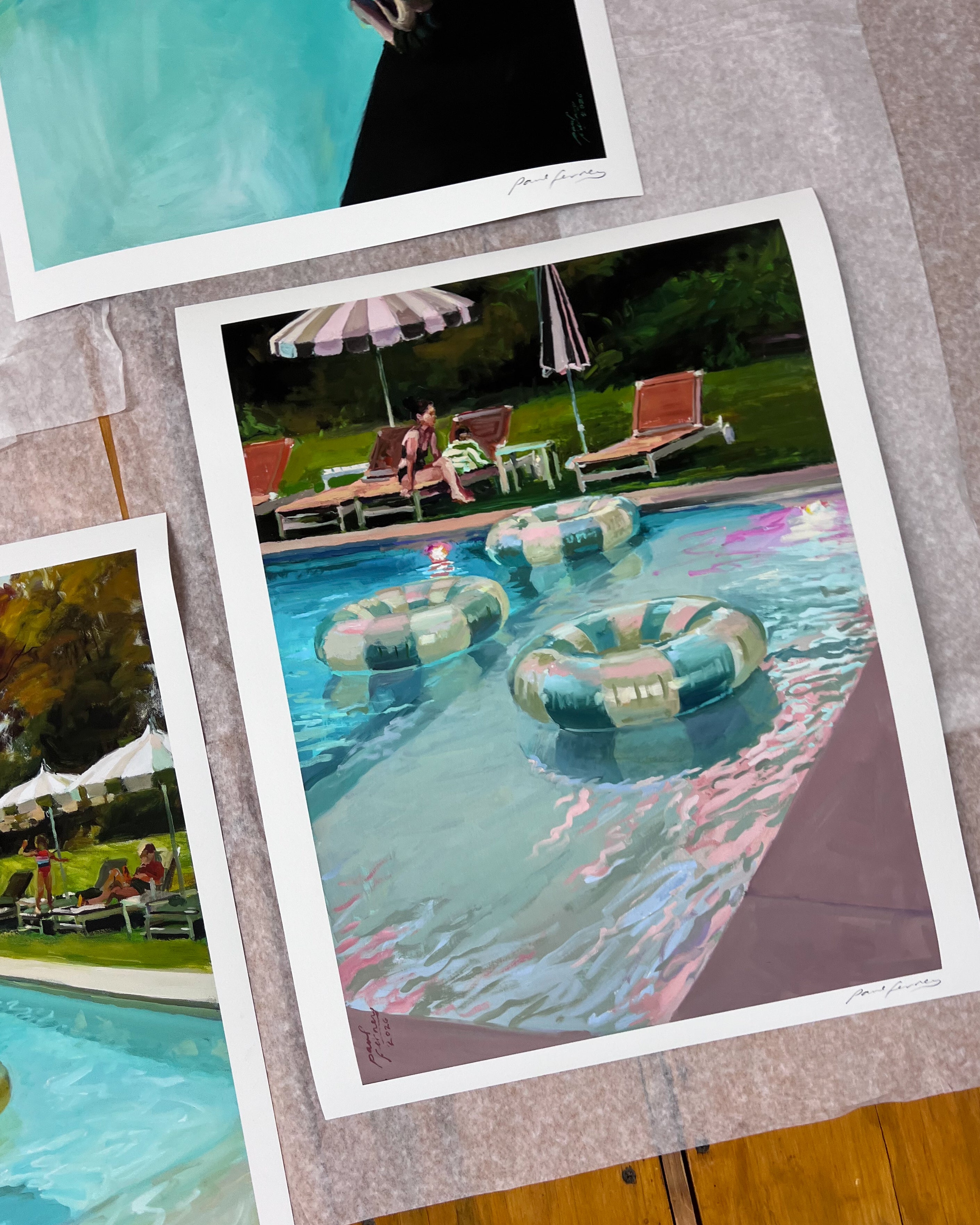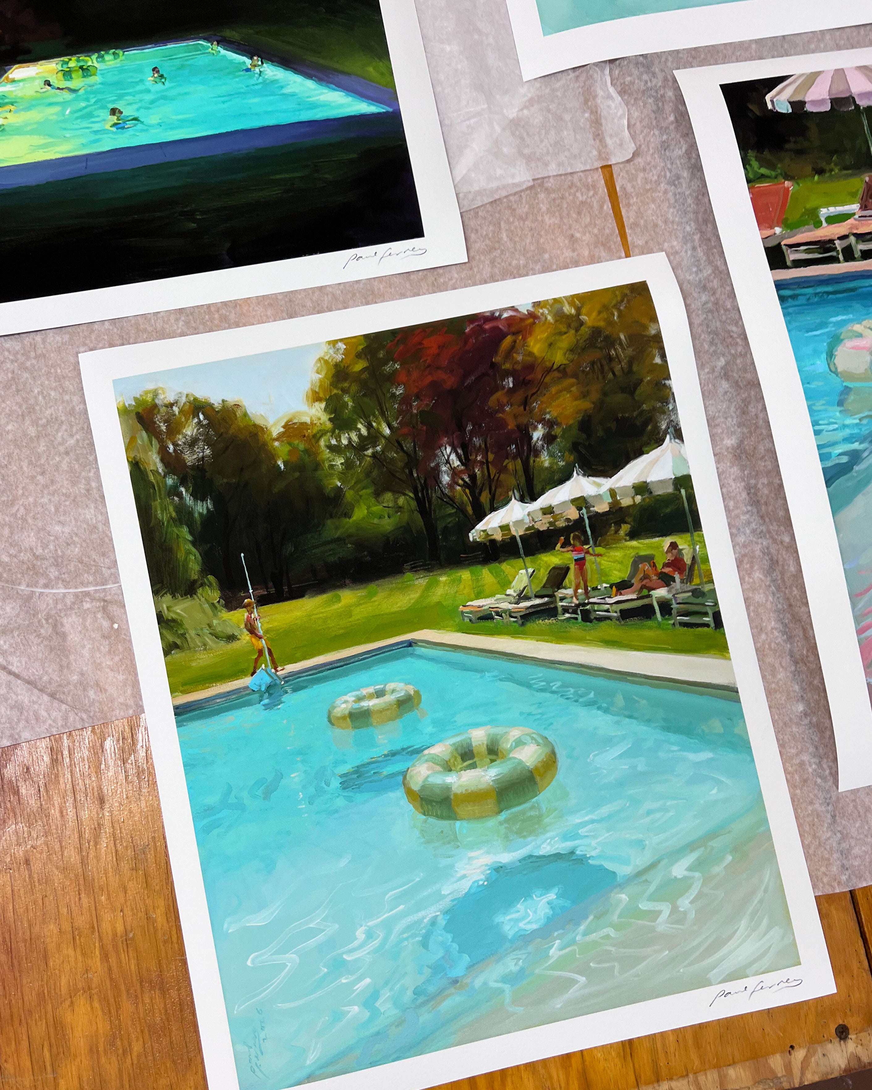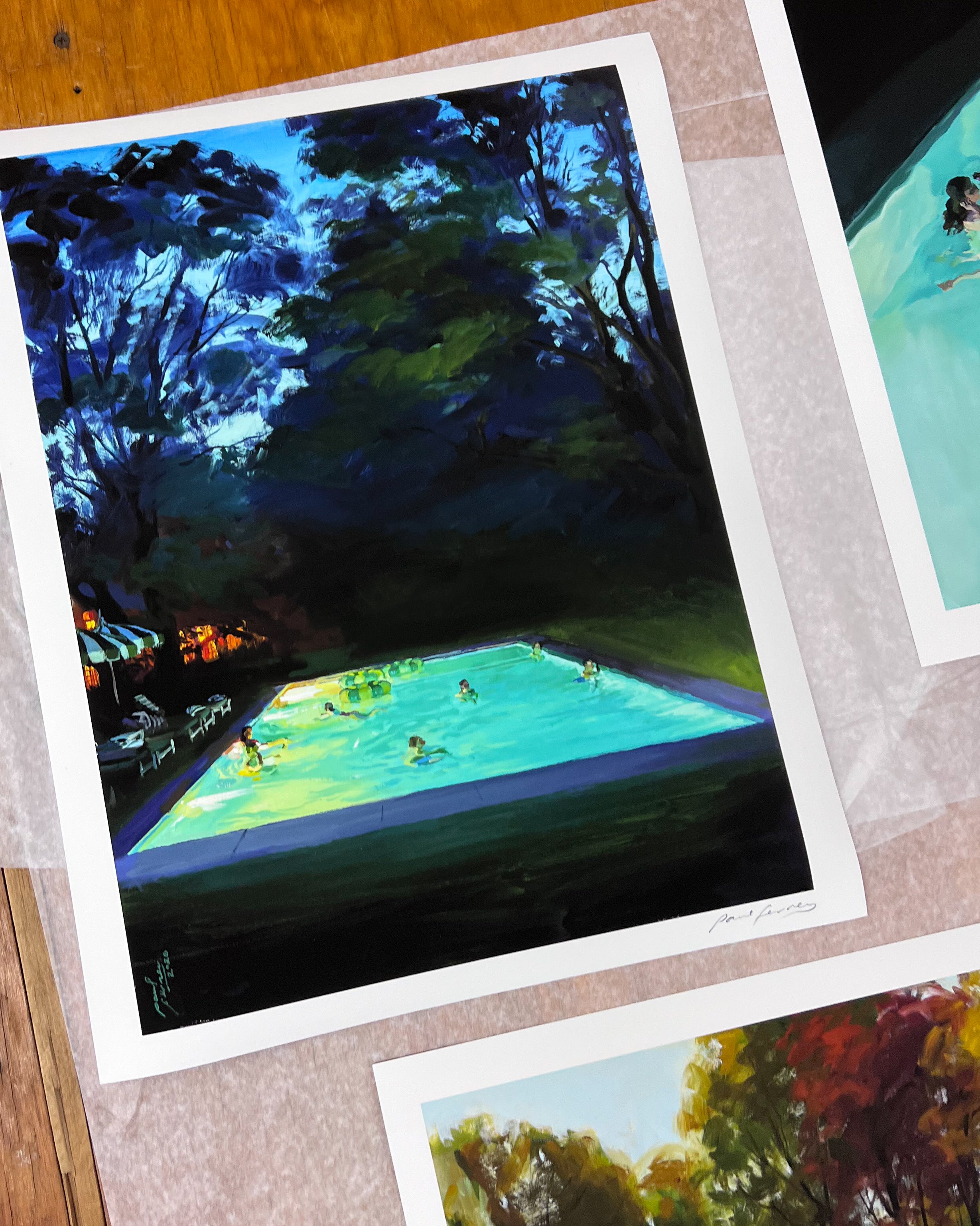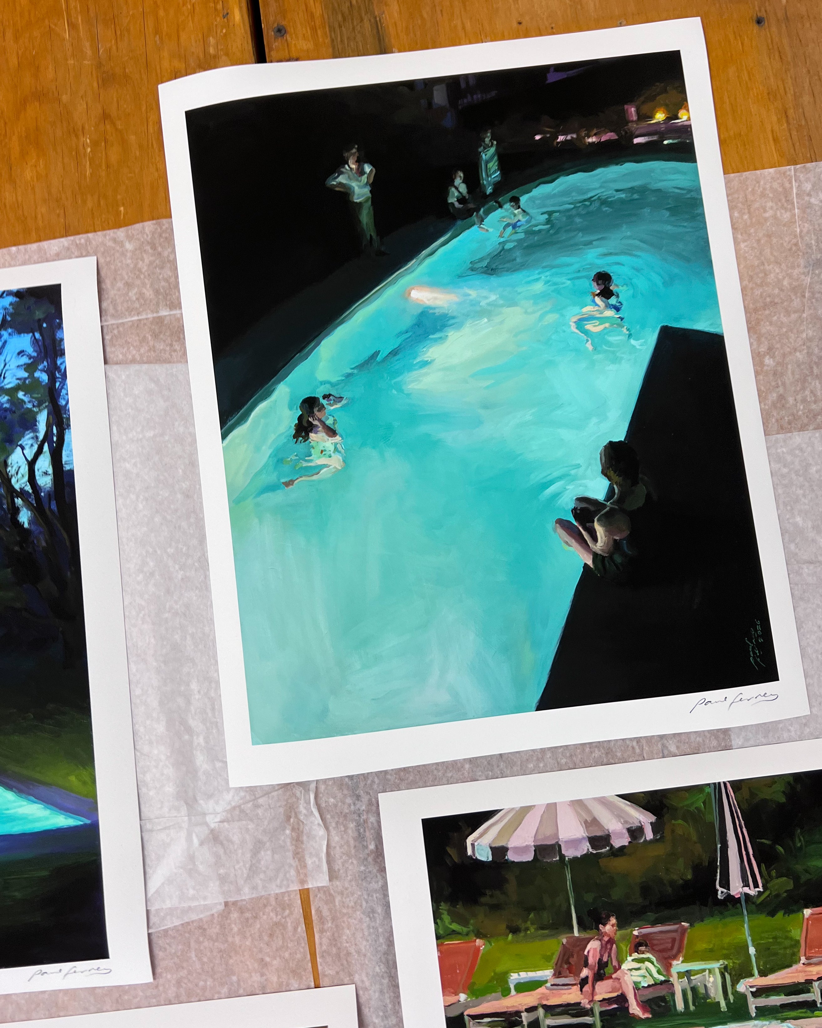 I've been thinking about how light and time shape who we are, and I'm proud to present this Day and Night series. In these new works, swimming and swimming pools show how light reshapes time, memory, and atmosphere. Under the sun, the water shimmers, revealing each movement with striking clarity. Time slows down or stops, and a scene is recorded. At night, the same water becomes less defined, time stretches, and becomes flexible. Everybody could be anybody, and every pool looks the same. At different hours, I'm exploring how time and context alter perception. Our external world versus our internal.